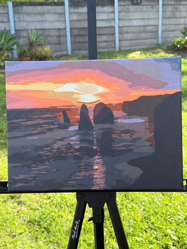 Every kit includes a premium textured canvas, a full set of pre-mixed acrylic paints, a 3-piece brush set, a numbered reference sheet, and easy step-by-step instructions. Everything you need arrives in one box.
